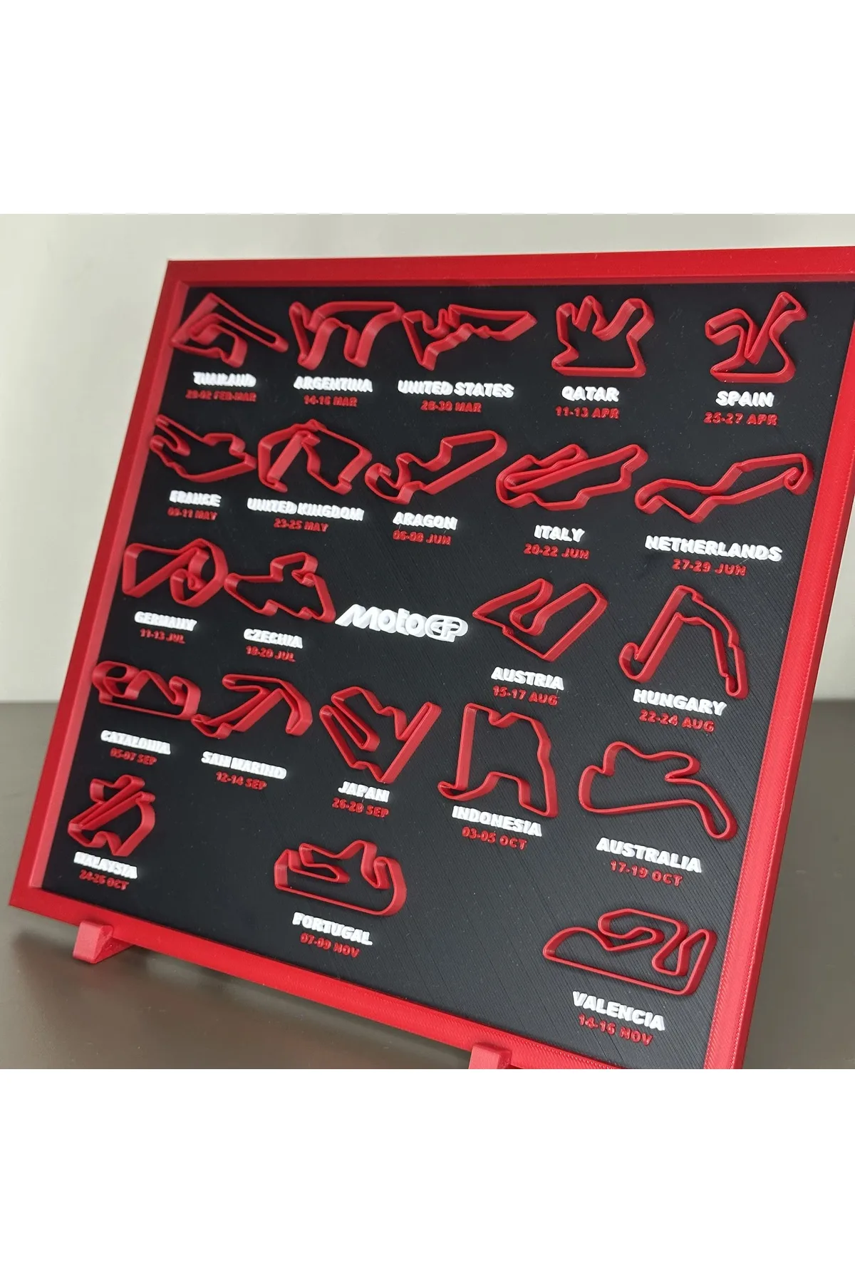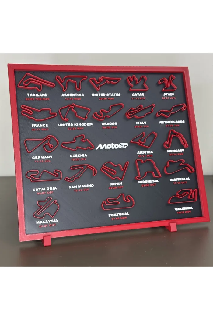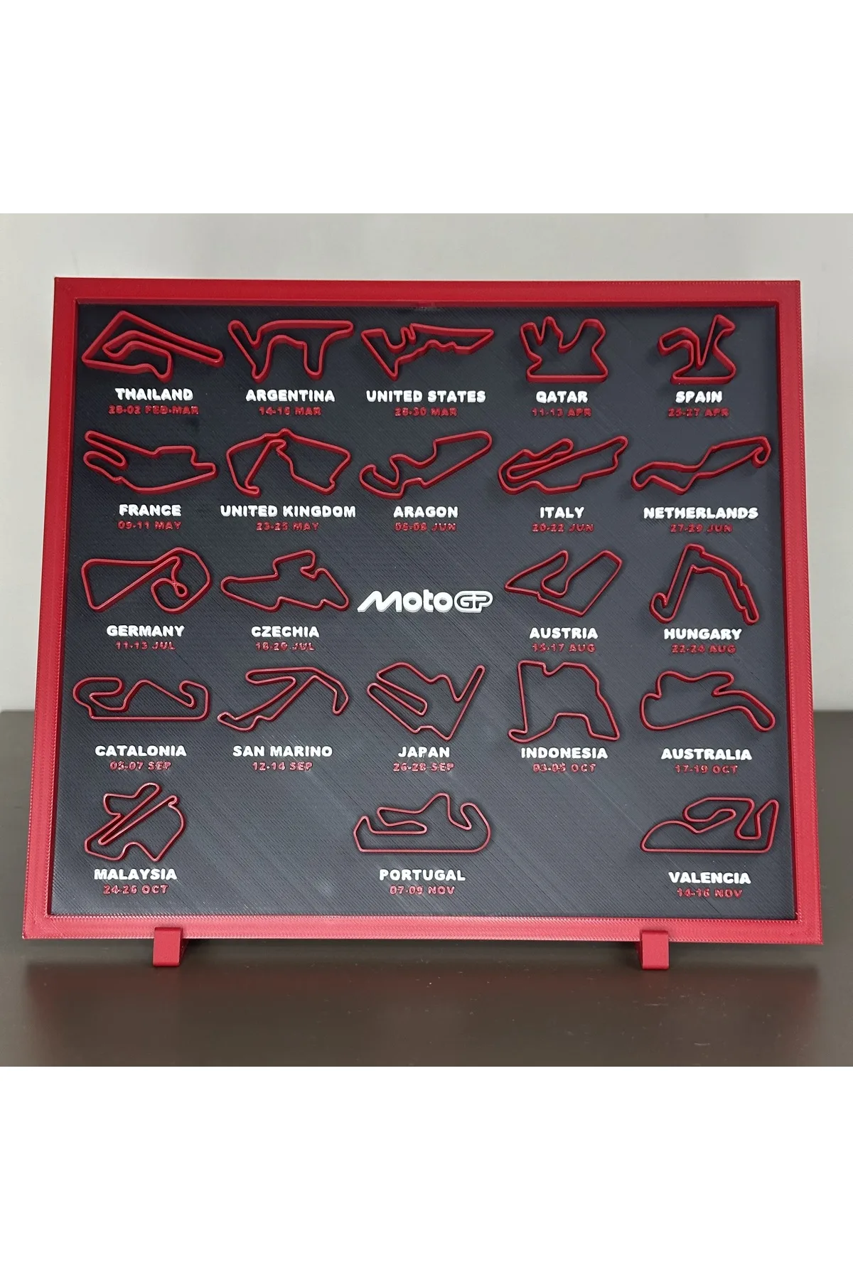 MotoGP tutkunları için yılın tüm yarış pistlerini gösteren şık bir koleksiyon parçasıdır. Ev, ofis veya garaj dekorasyonu için idealdir.