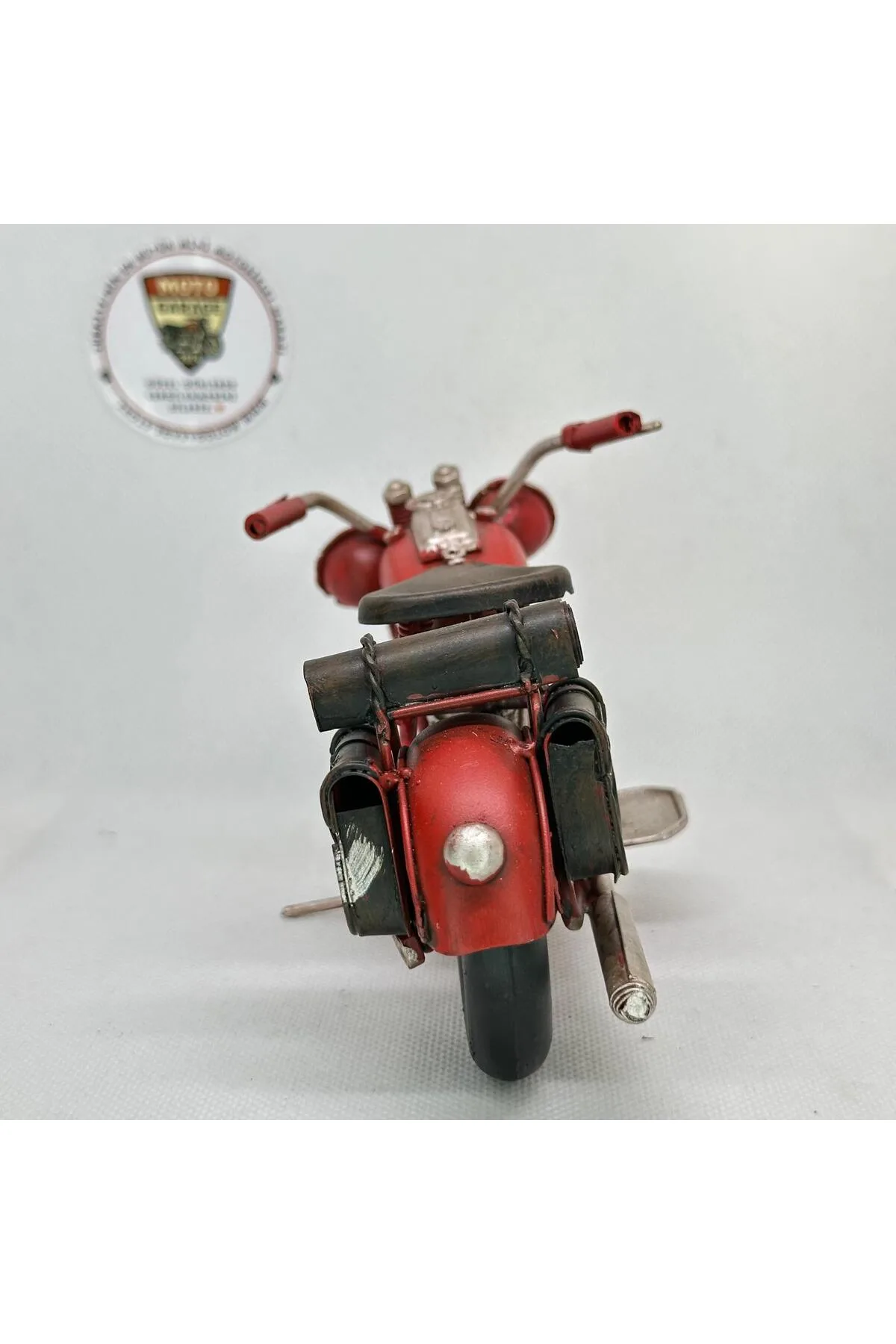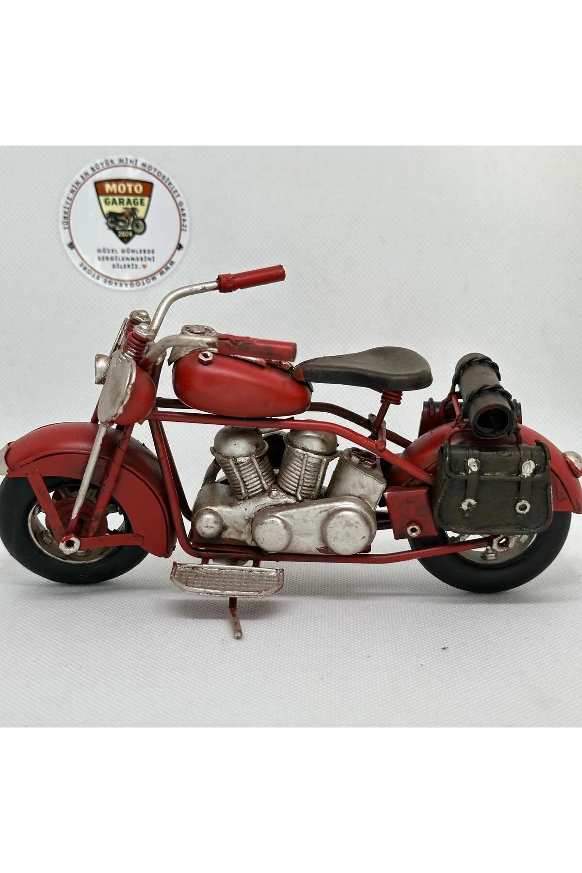 El Yapımı Kırmızı Yan Çantalı Cruiser Metal Motosiklet Biblosu – Retro Figür & Dekoratif Obje